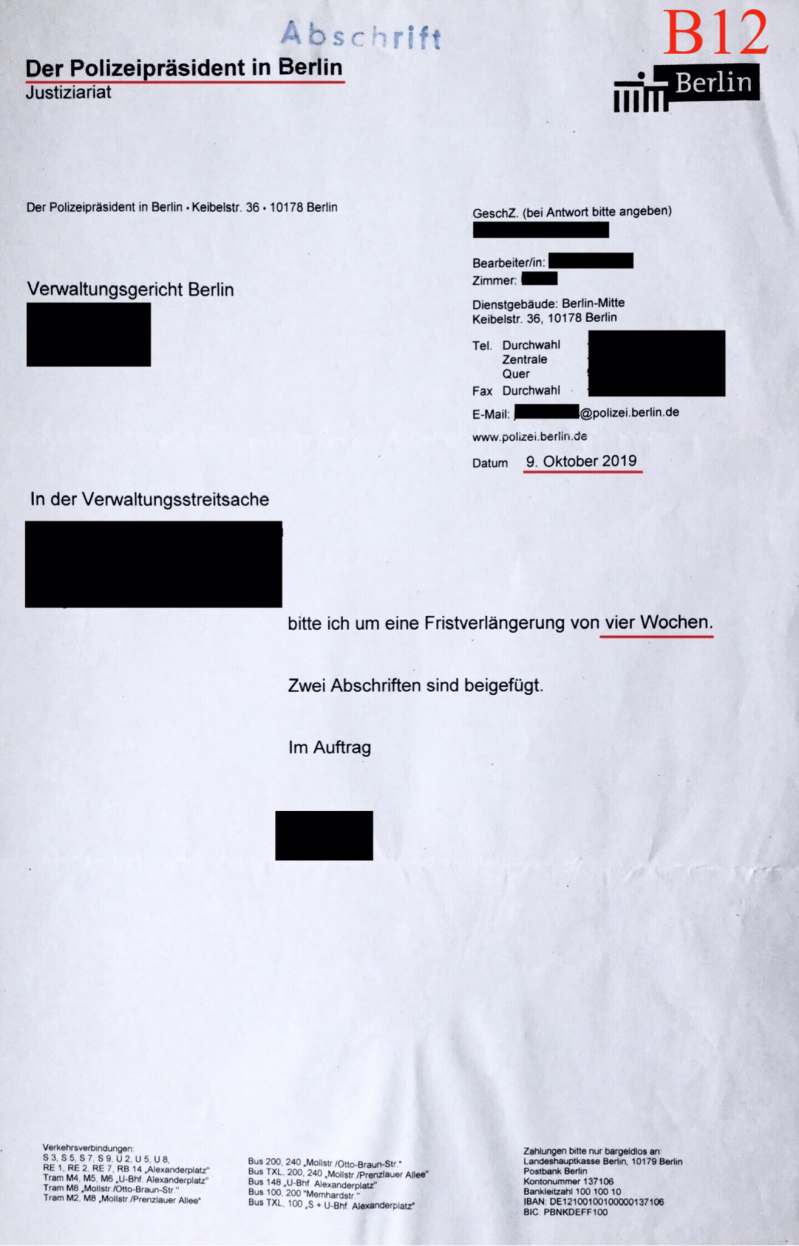 1a. Am 09. Oktober 2019 beantragt die vorbenannte Polizeidienststelle beim "Gericht" prompt Wartezeit, Fristverlängerung, um 4 Wochen.