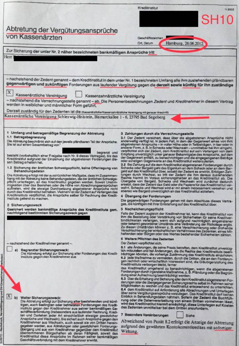 erneut gerade und teilen Sie ihm mit, dass die Beschuldigten der Kassenärztlichen Vereinigung nachweislich die vertragliche Vereinbarung mit der Bank unterschlagen und Abmachungen werden nicht eingehalten haben sowie, dass es maßgebend ein Vertrag vom 26.06.2012 vorliegt.